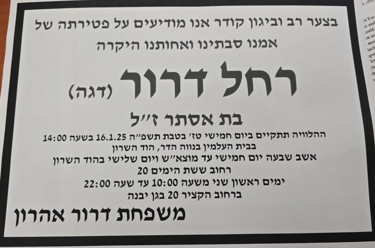 הבוקר הודיע דרור אהרון, ראש מועצת גן יבנה, על פטירת אימו היקרה, רחל דרור אמש. ההלוויה תיערכך היום, יום חמישי, טז בטבת תשפ"ה, 16.01.25 בשעה 14:00 בבית העלמחן בנווה הדר, הוד השרון. דרור, כך נמסר, יחלק את זמן השבעה בין הוד השרון וגן יבנה: החל מהיום חמישי ועד מוצ"ש, ובנוסף ביום שלישי הבא, יישב ברחוב ששת הימים 20 הוד השרון.