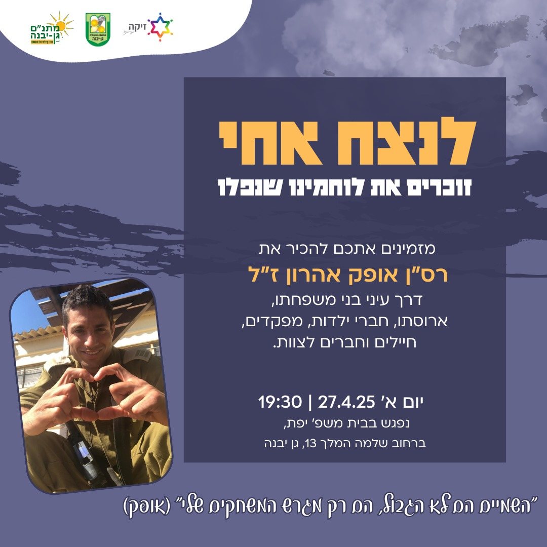 בסוף החודש יתקיים בגן יבנה ערב הנצחה מיוחד לרס"ן אופק אהרון ז"ל, שבו אפשר יהיה ניתן להכיר את דמותו של אופק ולהמשיך את הנצחתו.