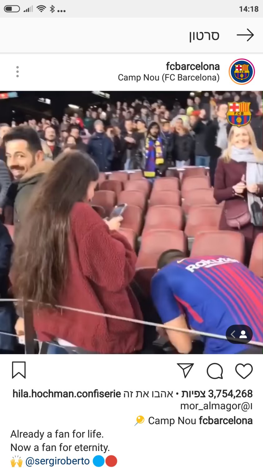 הזוג ירדן לאור וסתיו בונדר מגן יבנה הפכו בסוף השבוע לכוכבי רשת. הזוג יצא בשבוע שעבר לטיול של אחרי צבא. כאוהדי קבוצת ברצלונה אדוקים, הוחלט כי יאריכו את הטיול על מנת להגיע למשחק של הקבוצה האהובה ביום חמישי, היום בו חל יום הולדתה ה-21 של ירדן. הזוג רכש כרטיסי וי איי פי לשורה הראשונה ונהנה ממשחק בו ברצלונה נצחה את לבאנטה 0-3 במסגרת משחקי שמינית גמר גביע המלך. הזוג, שקרא במהלך המשחק "סרג'יו אנחנו מישראל אנחנו אוהבים אותך" זכה למחווה מרגשת מהשחקן שלא נשאר אדיש לקריאותיהם. השחקן המצליח ניגש אל הזוג וזרק לעברם את חולצתו הנושאת את המספר 20 . הוא חייך לעברם, נפנף לשלום ונעלם. סתיו הנרגש החל לבכות "באותו הרגע כשהוא התקרב לא ידעתי מה לעשות ואני מתרגש עד עכשיו" אמר סתיו. זוהי הפעם ה-5 בה צופה סתיו במשחק של ברצלונה במגרש הביתי שלה בספרד. את הפעם הזו, הוא בטוח לא ישכח.