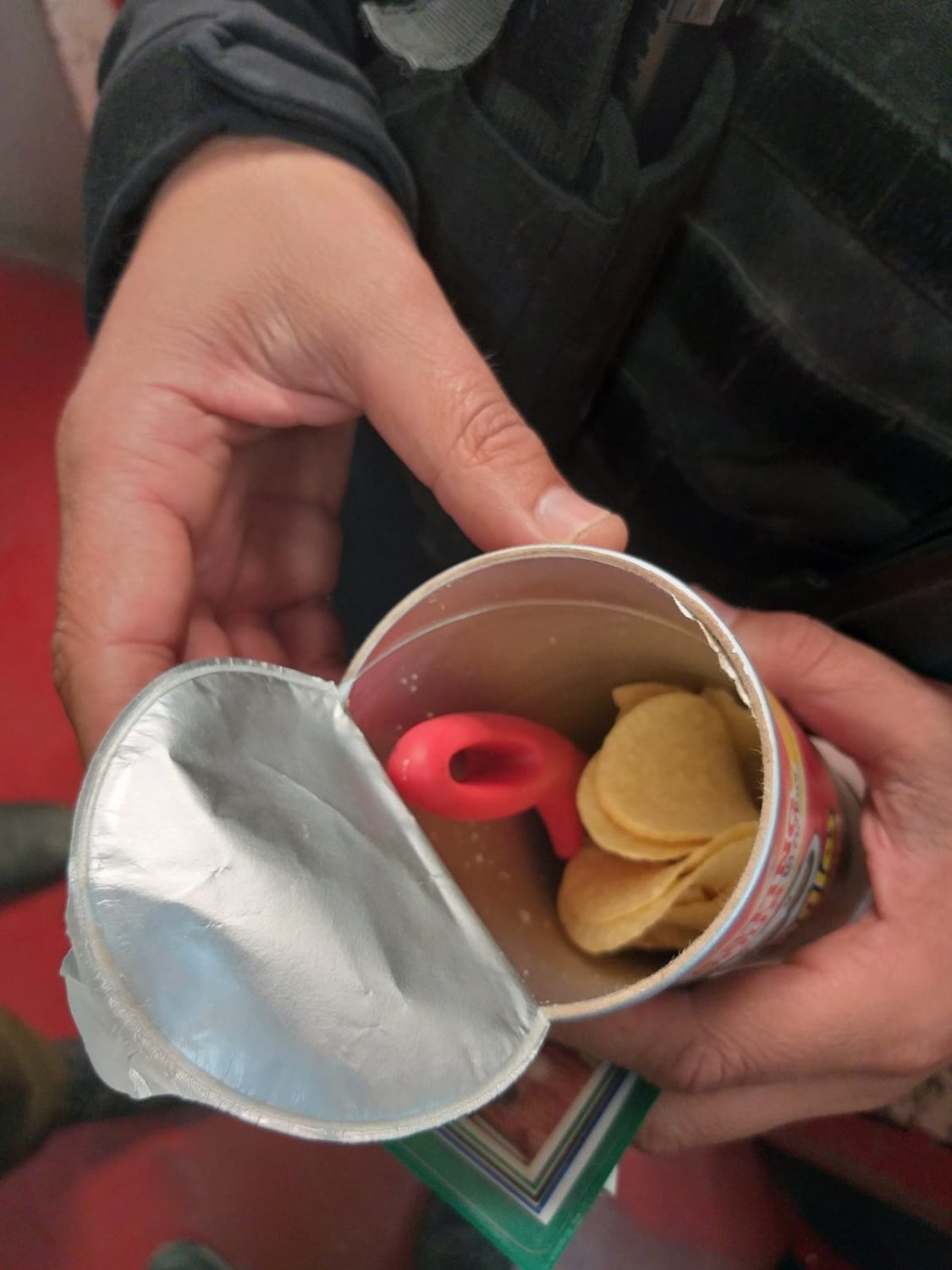 לאחר בדיקה בתיק של בת המיעוטים נמצאה סכין. "כאשר פתחנו את התיק לא ראינו שום דבר מלבד כמה חפצים אישיים וקופסא של חטיף. החלטתי לחפש בתוך הקופסא מאחר וראיתי את החפץ החד בשיקוף, והתגלתה הסכין" הלוחם מספר.