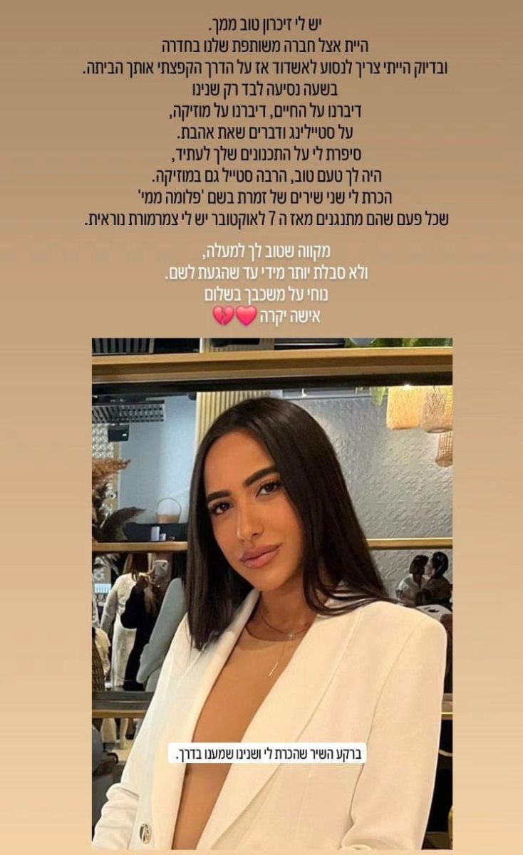 בפוסט כותב חסון: "יש לי זיכרון טוב ממך. היית אצלה חברה משותפת שלנו בחדרה, ובדיוק הייתי צריך לנסוע לאשדוד, אז על הדרך הקפצתי אותך הביתה, בשעה נסיעה, רק שנינו, דיברנו על החיים, דיברנו על מוזיקה, על סטייליניג, ודברים שאת אהבת.