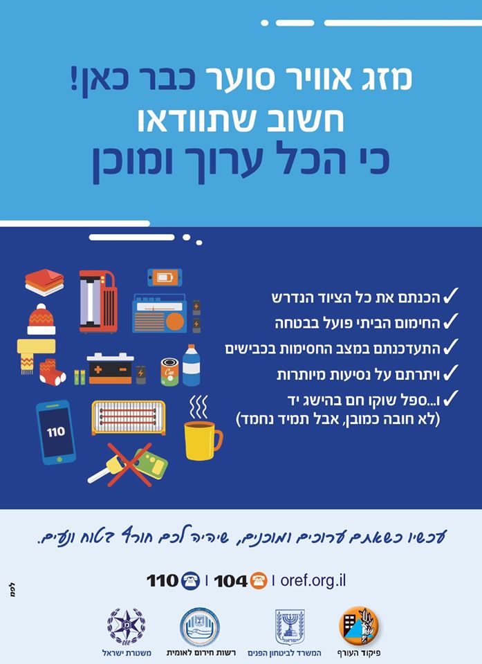 צוותי המועצה מבצעים סיורים ביישוב, פותחים קולטנים, מכינים כלי ציוד מכני הנדסי וכן גנרטורים. הצותים ערוכים ושומרים על כוננות גבוהה כדי להיות מוכנים לכל קריאה. יש לדווח למוקד העירוני על כל מפגע בו אתם נתקלים.