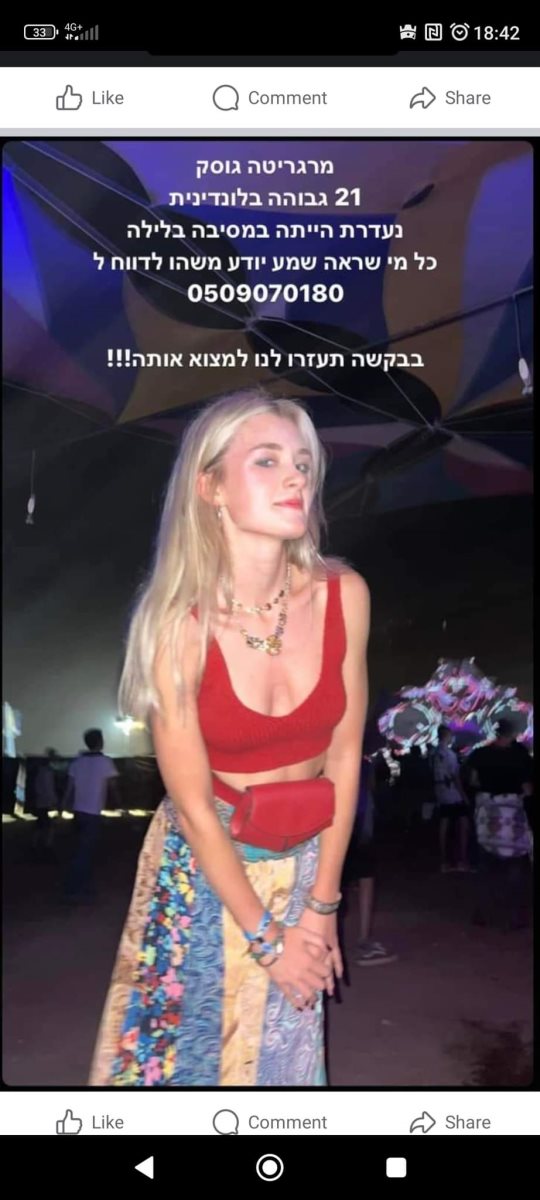 בשעות האחרונות, מתמלאות קבוצות הפייסבוק של גן יגנה, בהודעות ובבקשה לאתר את תושבת היישוב, מרגריטה גוסק. מרגריטה גוסק, תושבת גן יבנה, ובן זוגה סיימון ויגדרגאוז מראשון לציון, מוגדרים מנותקי קשר, מאז שעות הבוקר. השניים חגגו במסיבת היער בה מצאו רבים את עצמם מותקפים בידי בני עוולה. כל היודע מקום הימצאם מוזמן להודיע למערכת גן יבנה נט