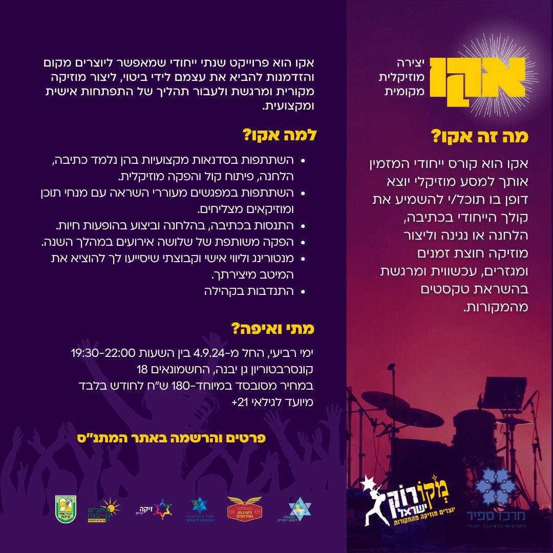 תכנית זיקה ומתנ"ס גן יבנה יוצאים בקרוב עם פרוייקט "אקו"- פרוייקט שנתי ייחודי שמאפשר ליוצרים מקום והזדמנות להביא את עצמם לידי ביטוי, ליצור מוזיקה מקורית ומרגשת ולעבור תהליך של התפתחות אישית ומקצועית