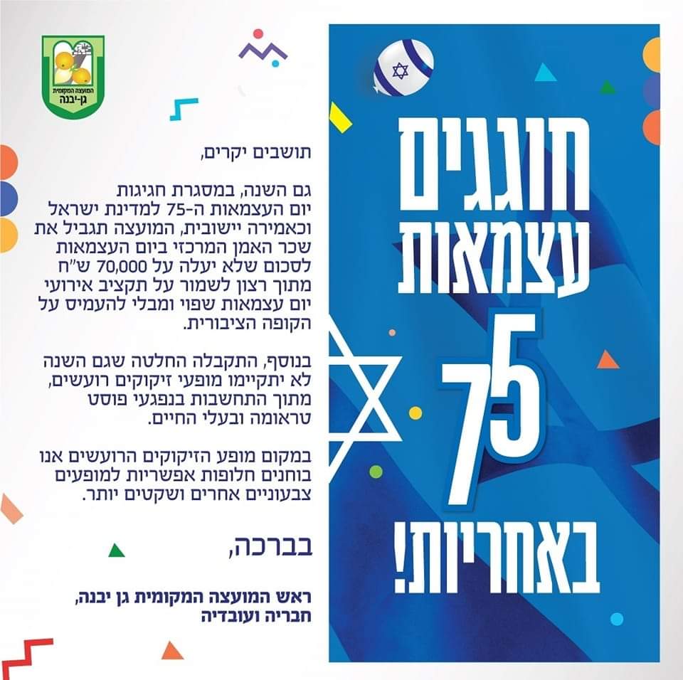 אתמול הודיע אהרון דרור, ראש מועצת גן יבנה, כי גם השנה, במסגרת חגיגות יום העצמאות ה-75 למדינת ישראל, יוגבל תקציב יום העצמאות, יוגבל שכר אמן מרכזי, ולא יתקיים מופע זיקוקים (נבחנות אפשרויות שקטות יותר).