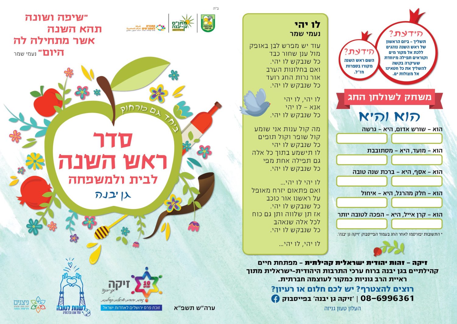ביוזמת מתנדבי תכנית "זיקה" הפיקה המועצה המקומית גן יבנה סדר ראש השנה מיוחד המחולק בימים אלו לתיבות הדואר ביישוב.