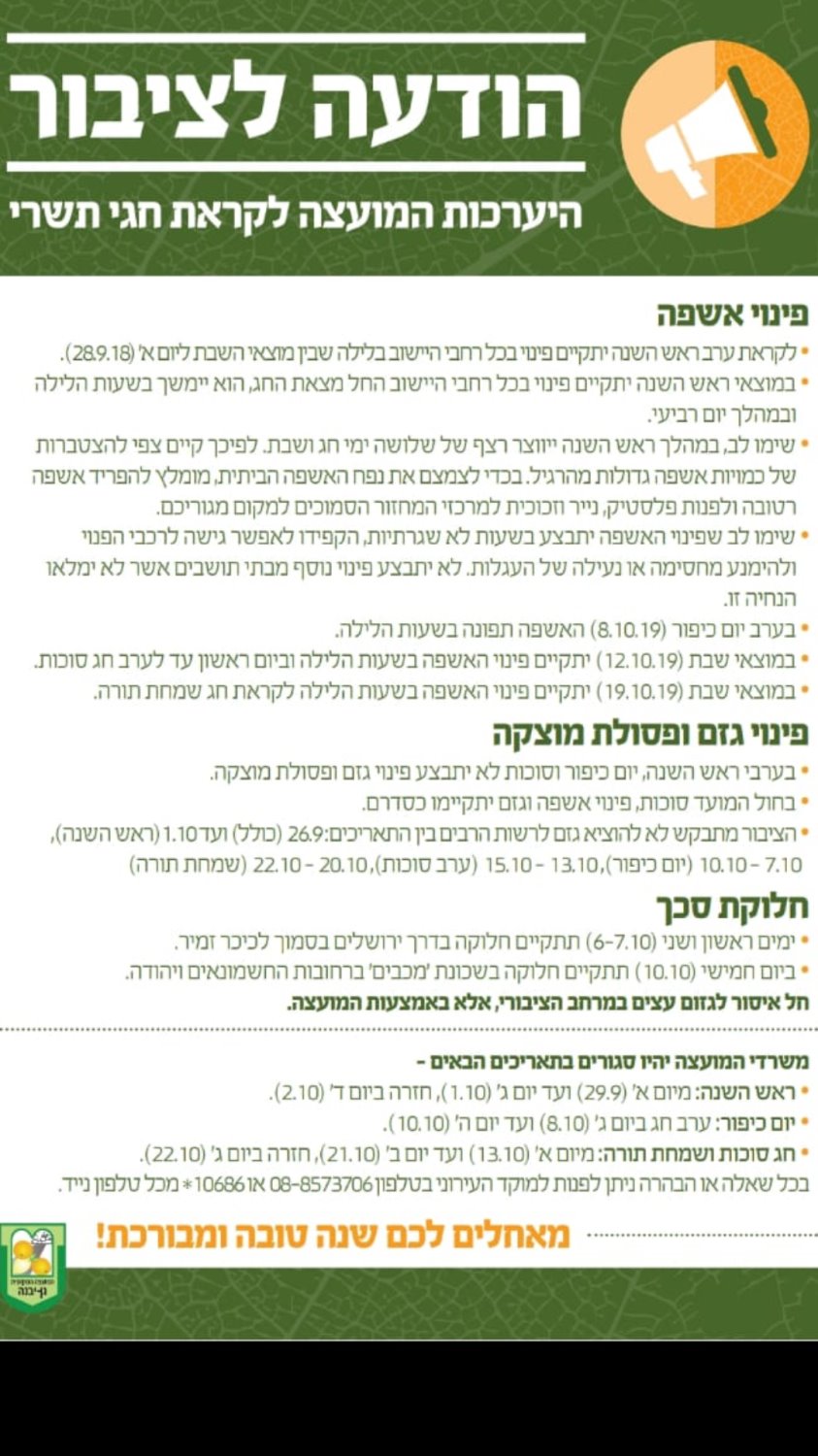 כל מה שאתם צריכים לדעת על פינוי אשפה וגזם, חלוקת סכך לסוכות ושעות הפעילות של המועצה במהלך החגים.