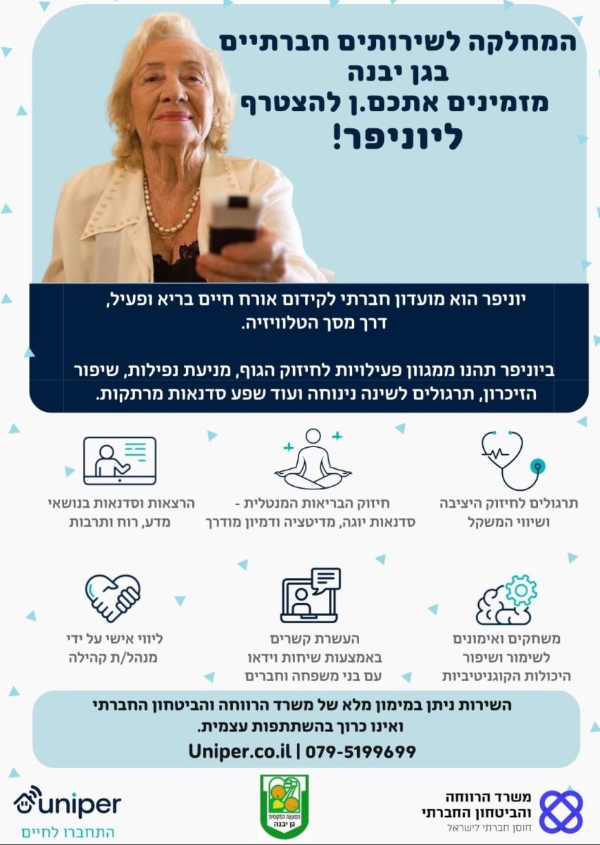 "תושבים ותיקים שימו 💙 יש לנו מתנה בשבילכם! המחלקה לשירותים חברתיים בגן יבנה מזמינה אתכם.ן להצטרף ליוניפר- המועדון החברתי לקידום אורח חיים בריא ופעיל דרך מסך הטלוויזיה."