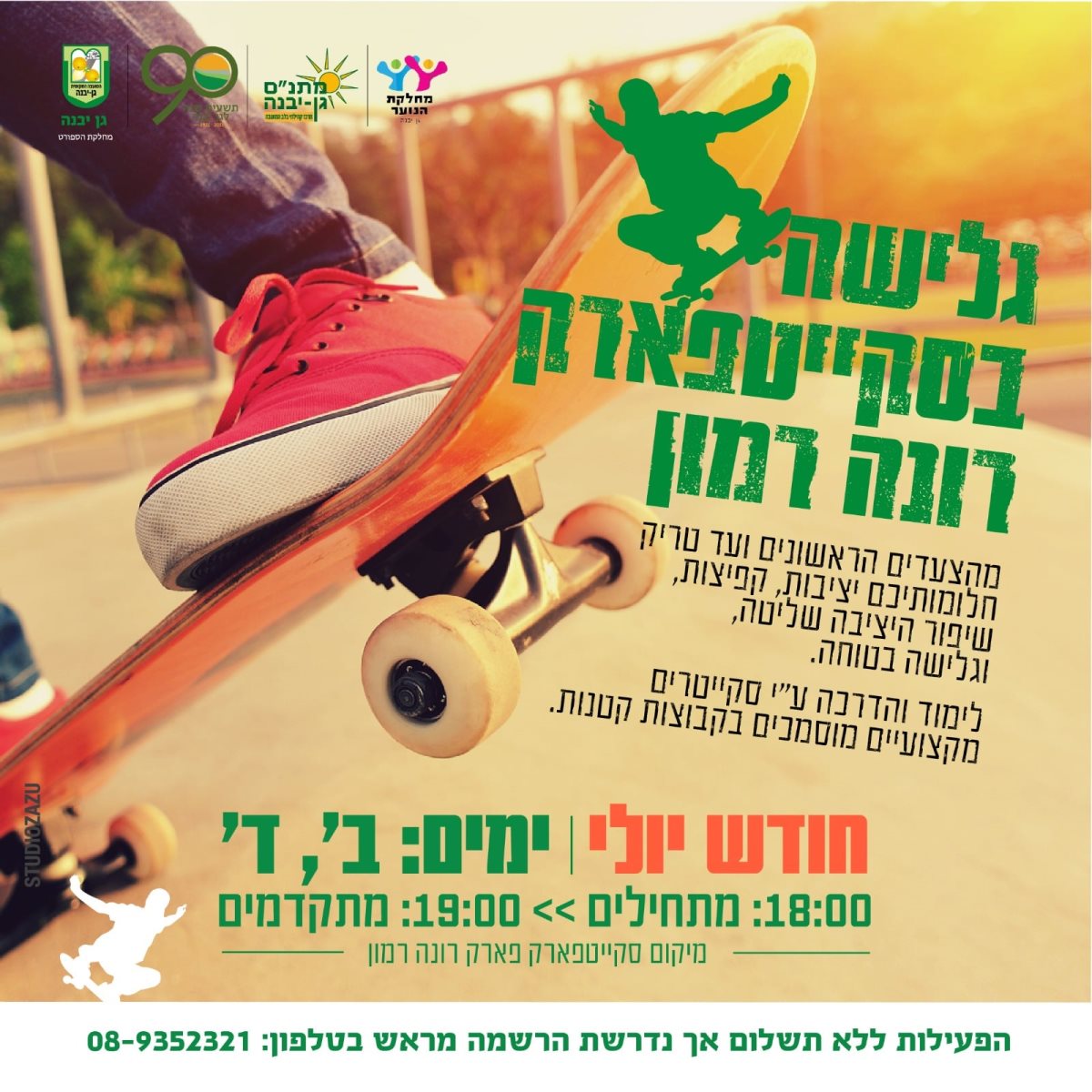 הכינו את בגדי הים. POOL PARTY מקפיצה בבריכת גן יבנה החל מהשעה 20:00 בנוסף, גלישה בסקייטפארק רונה רמון עם הדרכה של סקייטרים מקצועיים.