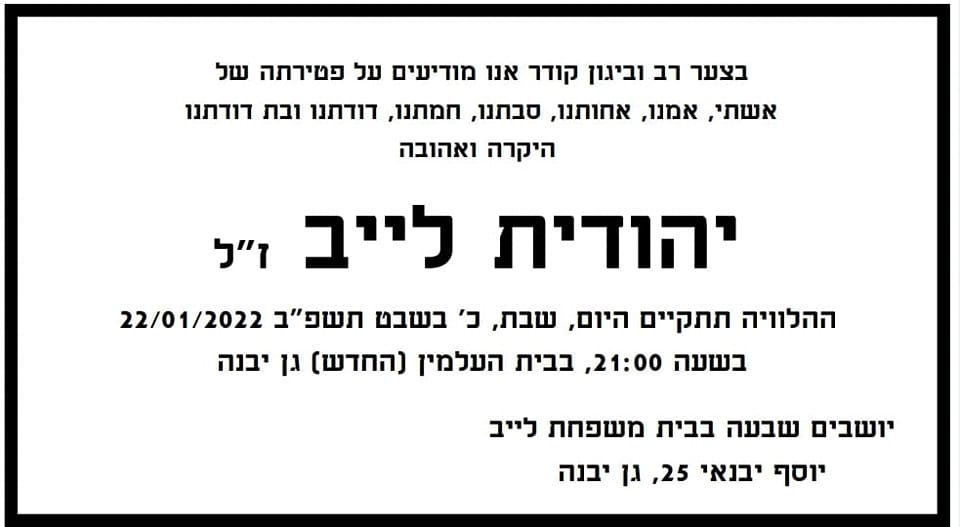 יהודית לייב, תושבת גן יבנה, ודמות מוכרת בישוב, הלכה לעולמה לאחר מאבק קשה וארוך במחלה קשה. הלווייתה התקיימה היום, מוצ"ש 22/01/2022 בשעה 21:00 בבית העלמין גן יבנה.