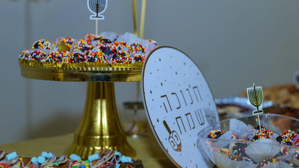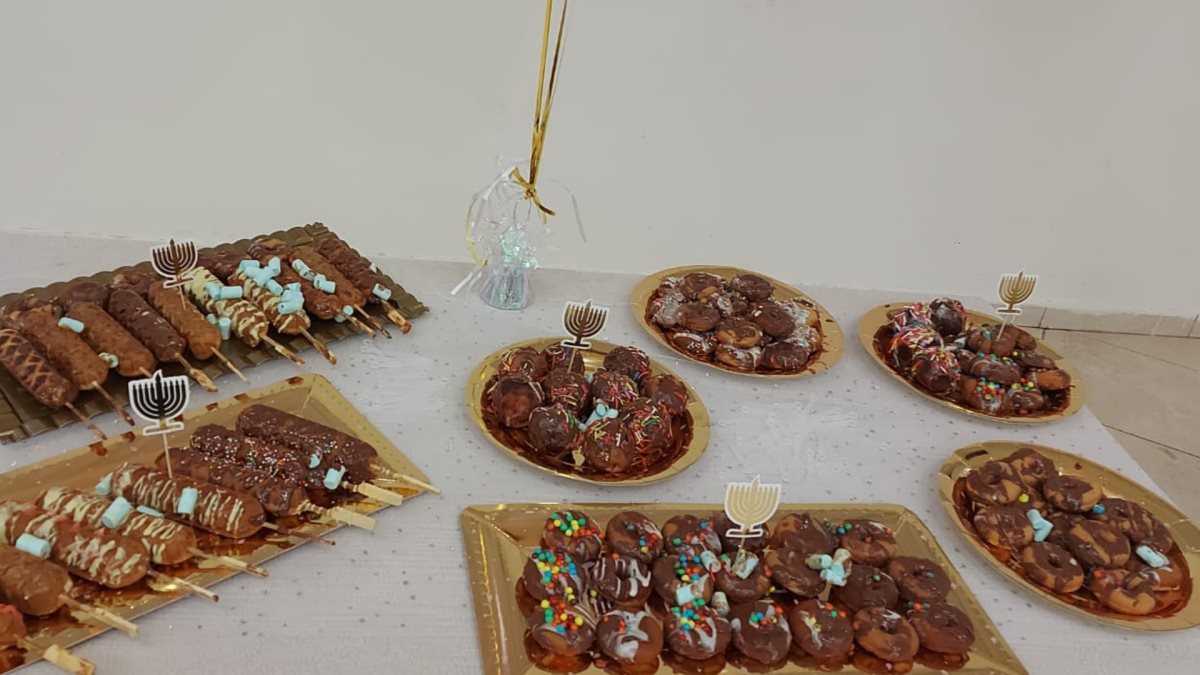 בתמונה: שולחנות עמוסים כל טוב במסיבת החנוכה של ילדי בית אפל
