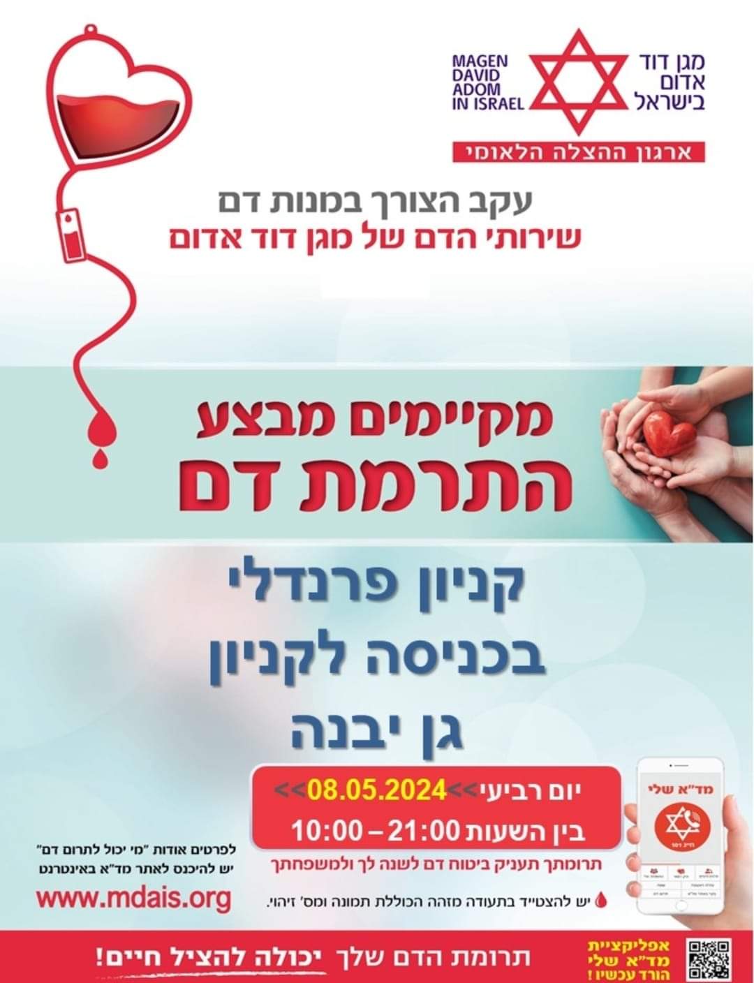 כאמור, מחר, יום רביעי, 8.5.24, יקיימו שירות הדם של מגן דוד אדום מבצע התרמת דם בכניסה לקניון הפרנדלי גן יבנה.