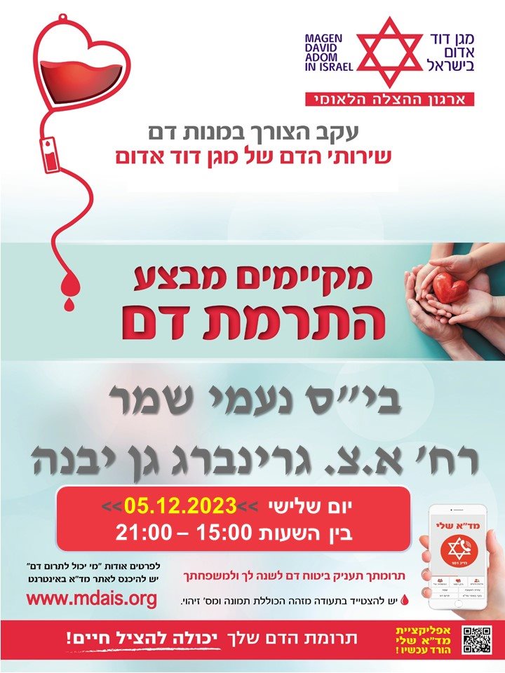 שימו לב: בכדי להימנע מהתקהלות ולמען הסדר, יש לקבוע תור ולמלא שאלון ממוחשב באתר מד"א או בקישור הבא: https://bd.mda.org.il/#/pub-schedule/11a9119a-b5a2-48b3-a7d7-549d5ea0b5ee עדיפות לתרומה תינתן לבעלי סוג דם O.