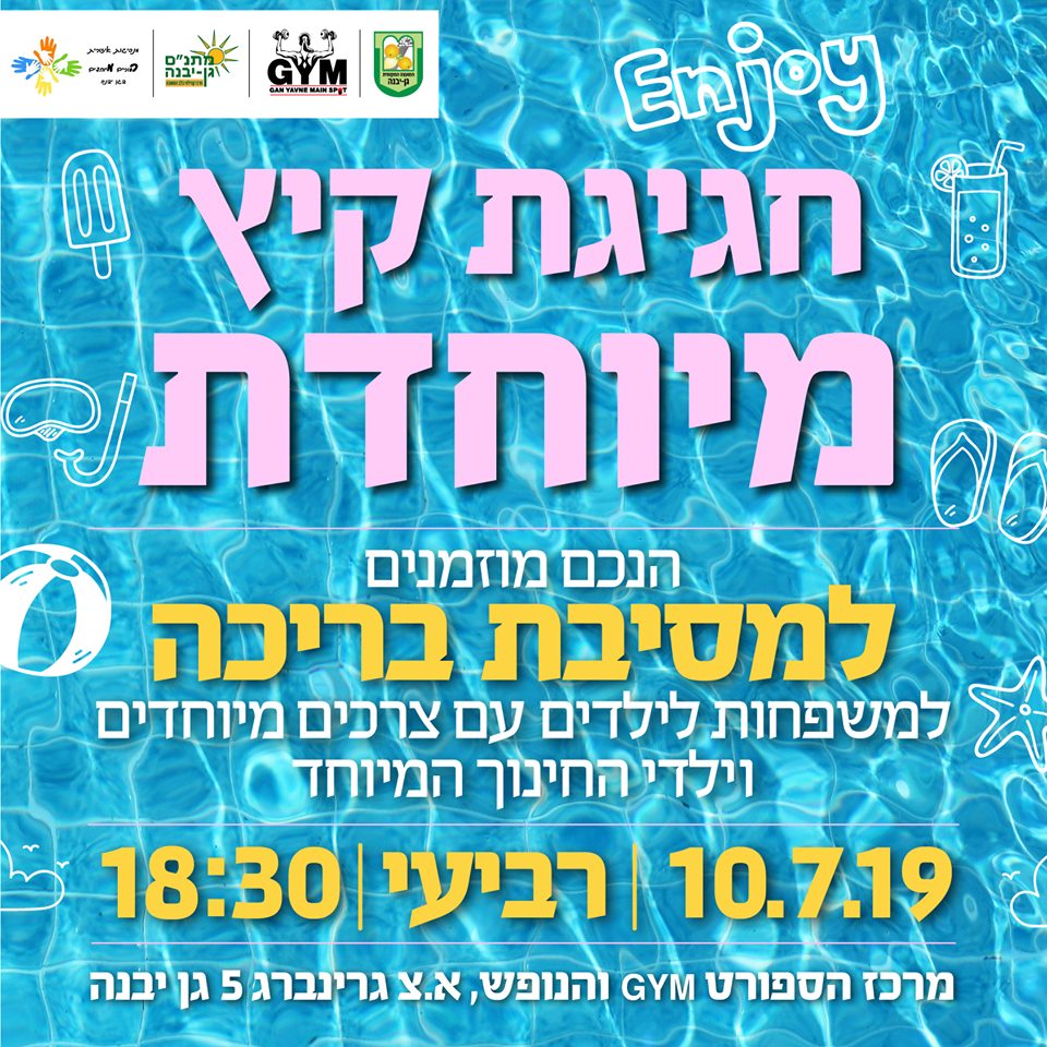 מסיבה מיוחדת למשפחות עם צרכים מיוחדים תתקיים בתאריך 10/7 בברכת הקאנטרי גן יבנה. מה מחכה במסיבה? הפעלות לכל המשפחה, אווירה חגיגית, ברכה מרעננת והמון המון הפתעות. מאחורי המסיבה שהפכה כבר למסורת עומדים בין היתר מתנ"ס גן יבנה, מנהיגות ההורים ופורום צרכים מיוחדים.