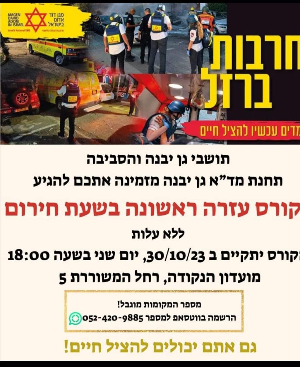 תושבי גן יבנה והסביבה, תחנת מד"א גן יבנה מזמינה אתכם להגיע לקורס עזרה ראשונה בשעת חירום, ללא עלות. הקורס יתקיים ביום שני הבא (30.10) בשעה 18:00 במועדון הנקודה, רחוב רחל המשוררת 5. שימו לב כי מספר המקומות מוגבל! הרשמה בוואצאפ מספר 052-4209885.