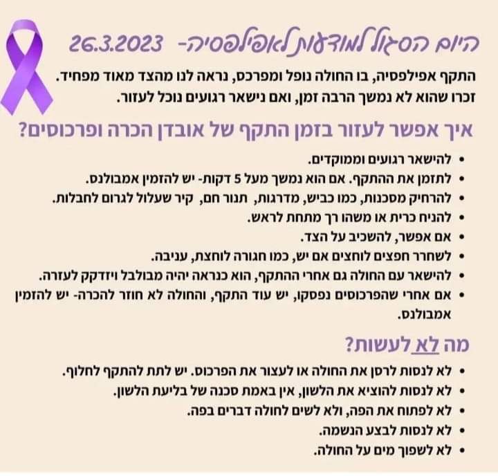ביום שלישי האחרון (26.3) צויין יום האפליפסיה הבינלאומי. רוני גיגי, מגן יבנה, לומדת בכיתה א 3 בבית הספר מכבים, והיא חולת אפילפסיה מורכבת. במסגרת יום האפילפסיה הבינלאומי, העבירה רוני המתוקה, מצגת וסרטון לכיתות א' בשיתוף עם המחנכת נילי מרטיין וחילקה לילדים צמיד סגול ופלקט שתלו בחדר המורים ובו הוראות מה עושים בזמן פרקוס.