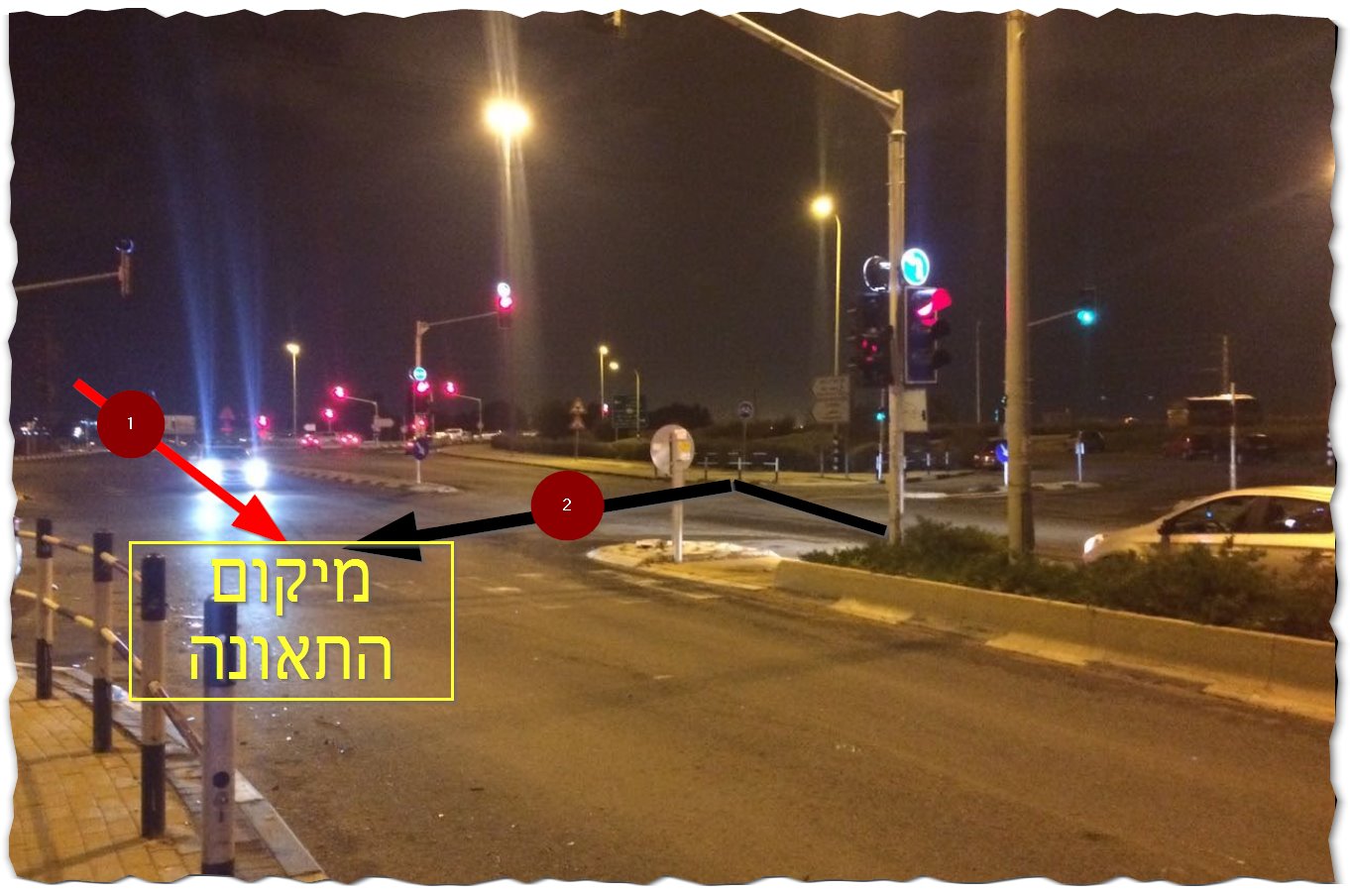 מהלך התאונה כמפורט בתמונה מטה - רכב מס' 1, פנה ימינה מהכביש הדרומי לכיוון גן יבנה, שבמקביל, רכב מס' 2 פנה שמאלה מגן יבנה לכיוון שתולים:
