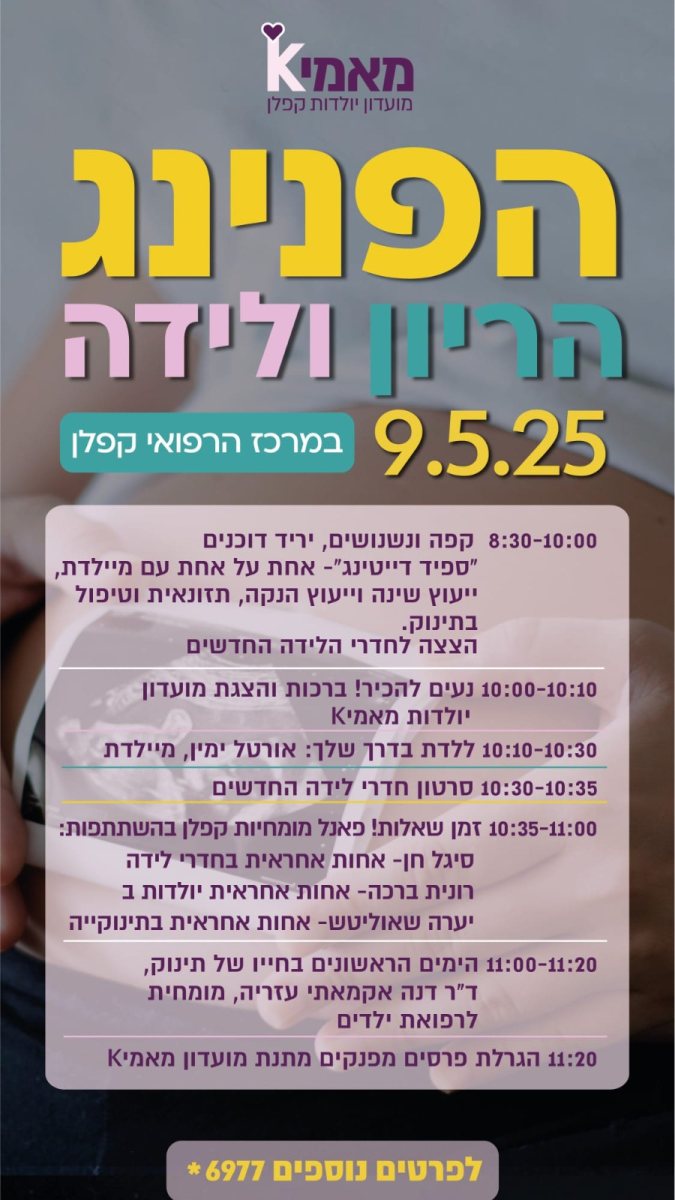 בנוסף תינתן הרצאה של ד"ר דנה אקמאתי עזרא – מומחית ברפואת ילדים, שתספק תובנות חשובות על הימים הראשונים עם הרך הנולד.