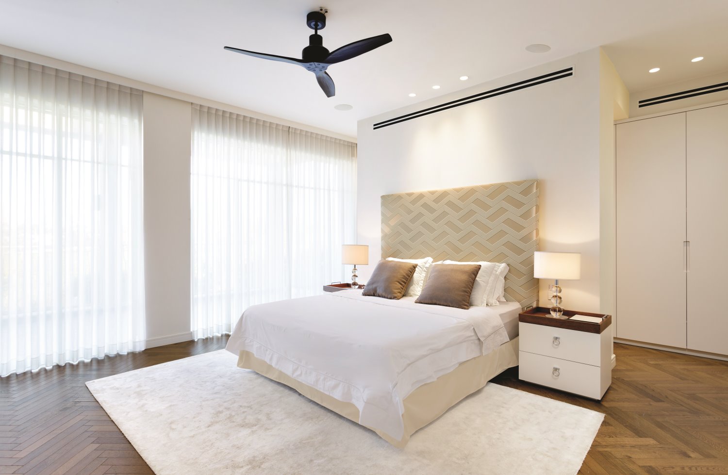 בקומה העליונה ביותר נמצאת סוויטת ההורים המפנקת, אותה בחר חסון לחלק לשלושה מקטעים. חלק אחד מוקדש לארונות ולמלתחה והוא מופרד בקיר חוצץ. בחלק המרכזי נמצאת מיטה עם ראש מיטה גדול ומרופד בטקסטיל בגוני בז' וקרם, ובחלק השלישי נמצא חדר הרחצה הזוגי המרשים. גם חלל הרחצה המהודר נחלק לשלושה חלקים: בצד אחד אסלה עם דלת, בקצה השני מקלחון עם חציצת זכוכית, ובאמצע אמבט Free standing לבן, הבולט במיוחד על רקע החיפויים בשחור, ארון עץ אלון ועליו משטח שחור, כיור ומראה.