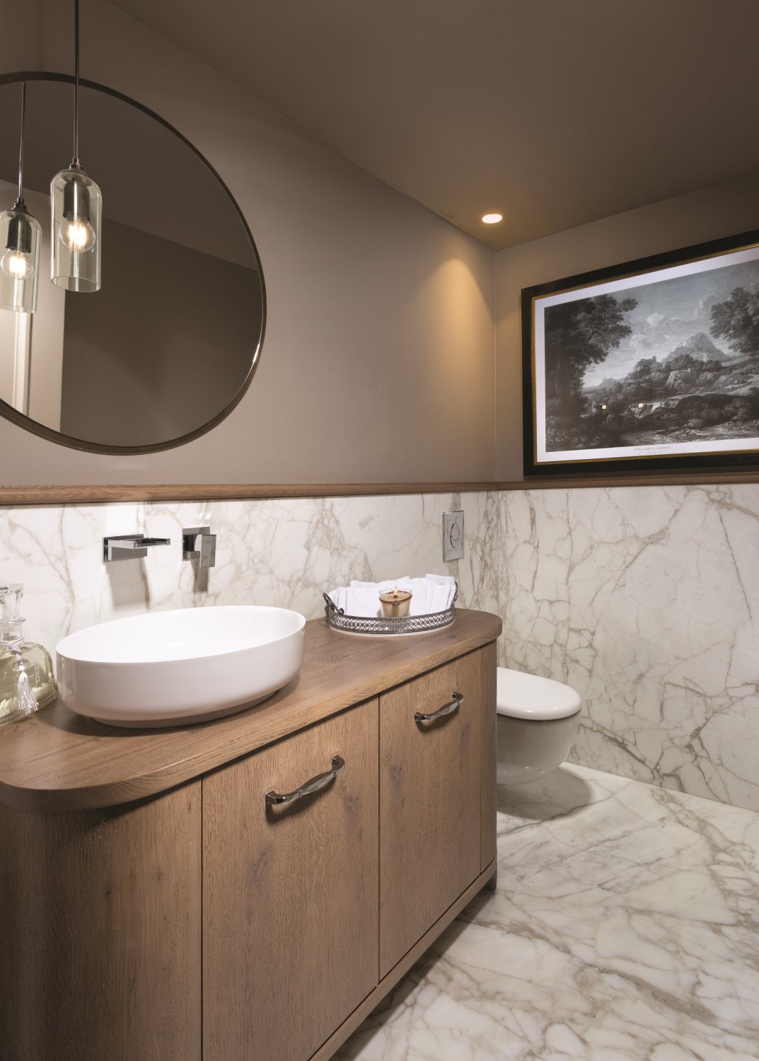 שירותי האורחים מרשימים במיוחד. "חיפינו את החלל באבן סטטואריו טבעית, שהיא שיש איטלקי יוקרתי ואיכותי, ממשפחת שיש קררה. בחרנו בפלטות שלמות ונקיות ושילבנו פס עץ, שגם חוזר ברצפה ובארון הרחצה הייחודי במראה הווינטג', שתוכנן ועוצב במיוחד עבור חלל זה", מסביר חסון. "הוספנו על הקירות והתקרה צבע של קפה, שמשלים את הפלטה של הצבעוניות הגרייז'ית של האבן הטבעית ושיוצר מראה שלם".