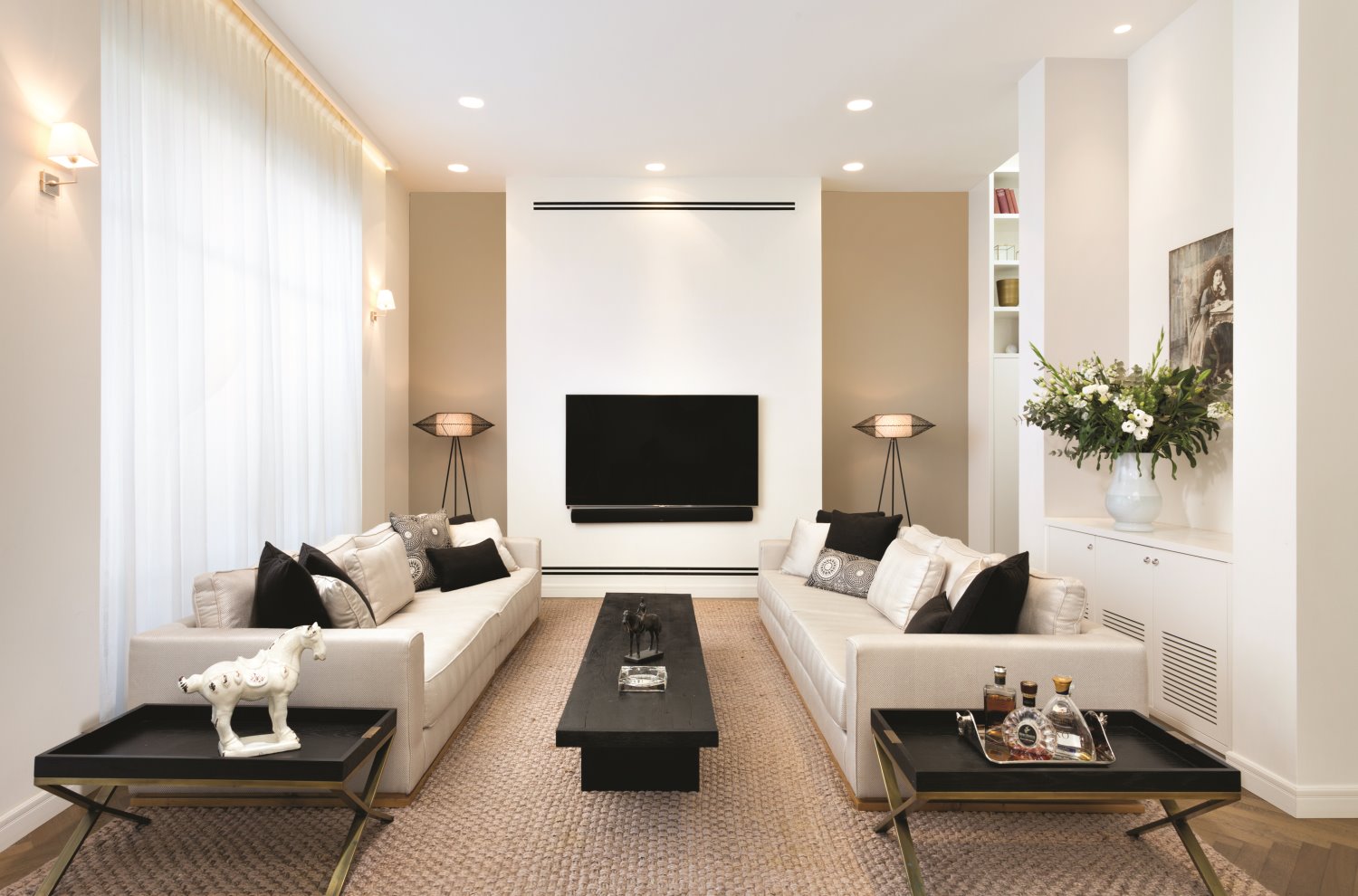 סלון הבית מאופיין ברהיטים באותם צבעים החוזרים לאורך הפרויקט, ובקווים נקיים, אלגנטיים וקלאסיים. ספות זהות ובהירות ניצבות זו מול זו וביניהן שולחן מלבני נמוך שחור. שולחנות צד שחורים זהים עם רגלי פליז בדומת X, גופי תאורה שחורים זהים ועומדים ופריטי טקסטיל ונוי בשחור-לבן-שמנת - כל אלה יוצרים תמונה סימטרית. את הקירות בחר חסון לצבוע בצבע קפה בהיר, כדי לאחד את כל הגוונים של החלל ולהוסיף עניין. הסלון זורם לכיוון הבריכה, כשמפרידים ביניהם חלונות בלגיים גדולים.