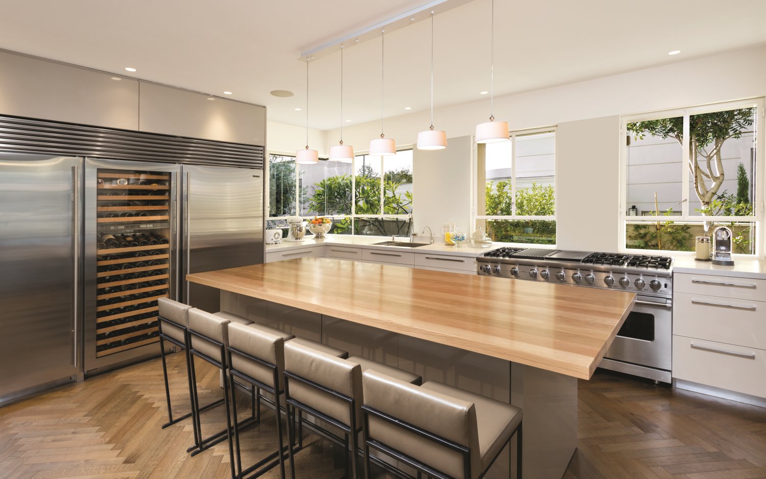 בקומת הכניסה נמצא גם מטבח רחב ידיים, שמרבית קירותיו הם חלונות הפונים לגינה מוריקה, המכניסים שפע של אור לחלל הנעים. היות שמדובר במשפחה שמאוד אוהבת לבשל ולארח, החלל הנקי והמואר מאובזר בתנור רחב, מקרר כפול שבו גם מקרר יין, ובמרכזו אי גדול, המחופה במשטח בוצ'ר. את הבית האלגנטי מקיפה גינה ובה בריכה מפנקת, המשמשת את ששת בני המשפחה ואת אורחיהם.
