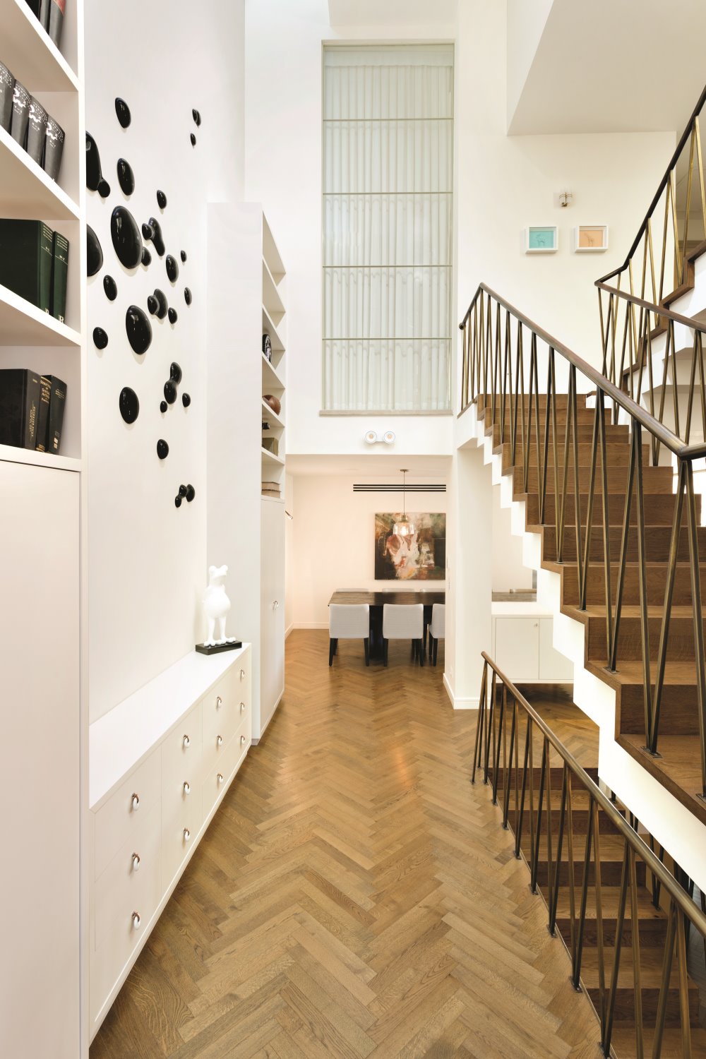 כדי להתמודד בהצלחה עם אתגר המדרגות, בחר חסון פלטת צבעים וחומרים מצומצמת, מהודקת ומדויקת: שחור, גוני שמנת, פליז שחוזר בכל מיני אלמנטים ועץ אלון טבעי בגוון טבק מעושן, שמרכך את הכל ומחמם את הבית. "כל הבית מרוצף בפרקט אלון בדוגמת Fish-bone קלאסית של HeziBank. הפרקט בעל צורה גיאומטרית חזקה, כאשר גם המעקה מפליז, המלווה את גרם המדרגות הממוקם במרכזו של הבית ומרחף בעזרת גשרים מקומה לקומה, מאופיין באותה צורה. המדרכים של המדרגות מחופים אף הם באותו חומר - עץ אלון טבעי מעושן בגוון טבק, כדי ליצור מראה אחיד והרמוני", מסביר חסון את בחירת החומרים ושילובם.