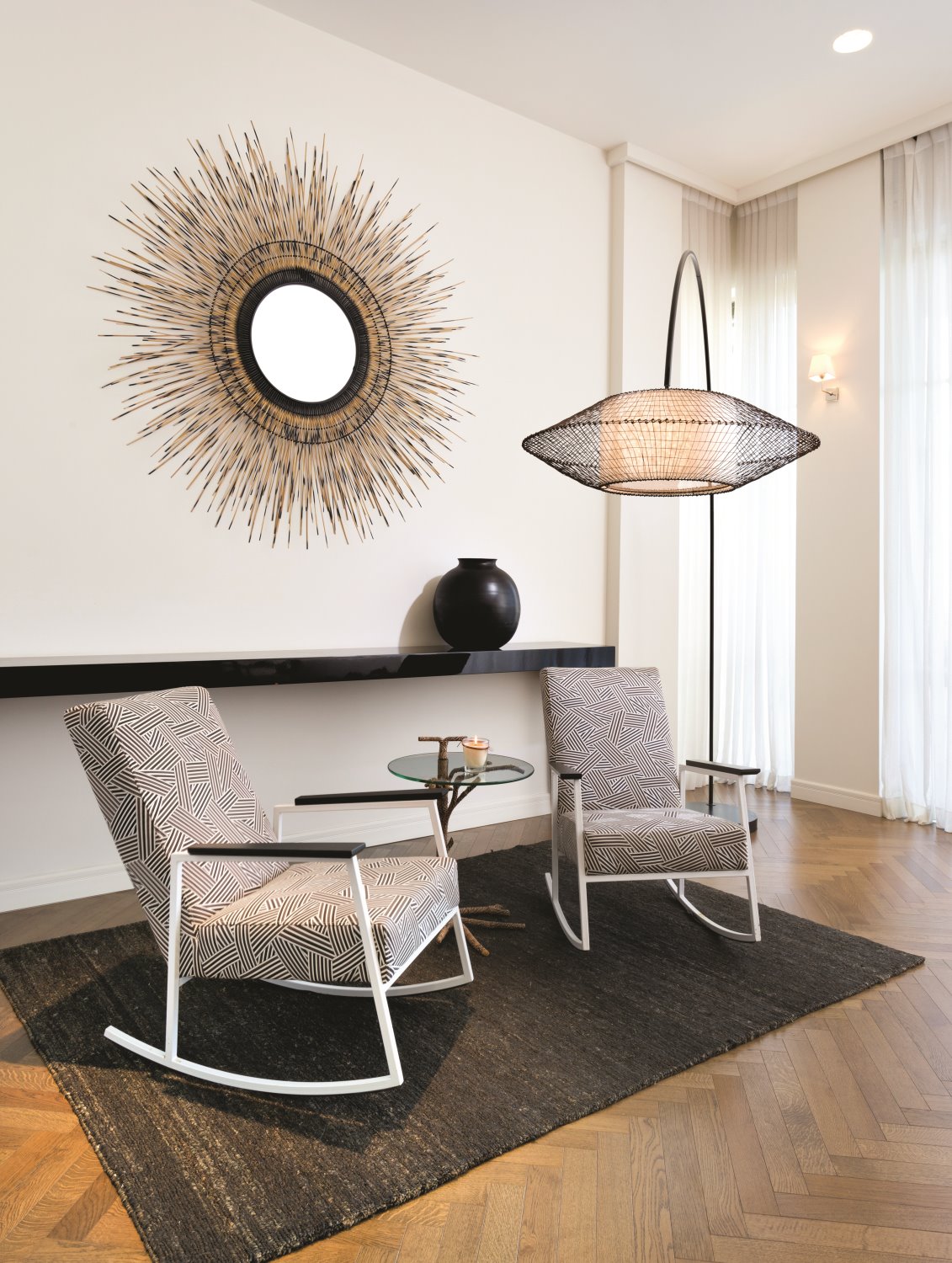 פינת ישיבה נוספת בקומה הציבורית מורכבת משטיח כהה במראה טבעי ועליו שתי כורסאות נדנדה, המחופשות בבד שחור-לבן בדוגמה גיאומטרית, גוף תאורה המתכתב עם אלו הניצבים בסלון ומראה מעוצבת. לצד המדרגות ולאורך שבעה מטרים, יצר חסון, בעזרת נגר, ספרייה גדולה בצבע לבן. את החלל משלימה יצירת אומנות ייחודית, של מעין טיפות שחורות מבריקות בגדלים שונים, שיוצרה בהתאמה אישית במיוחד עבור הבית ושמוסיפה נגיעות של שחור דרמטי.