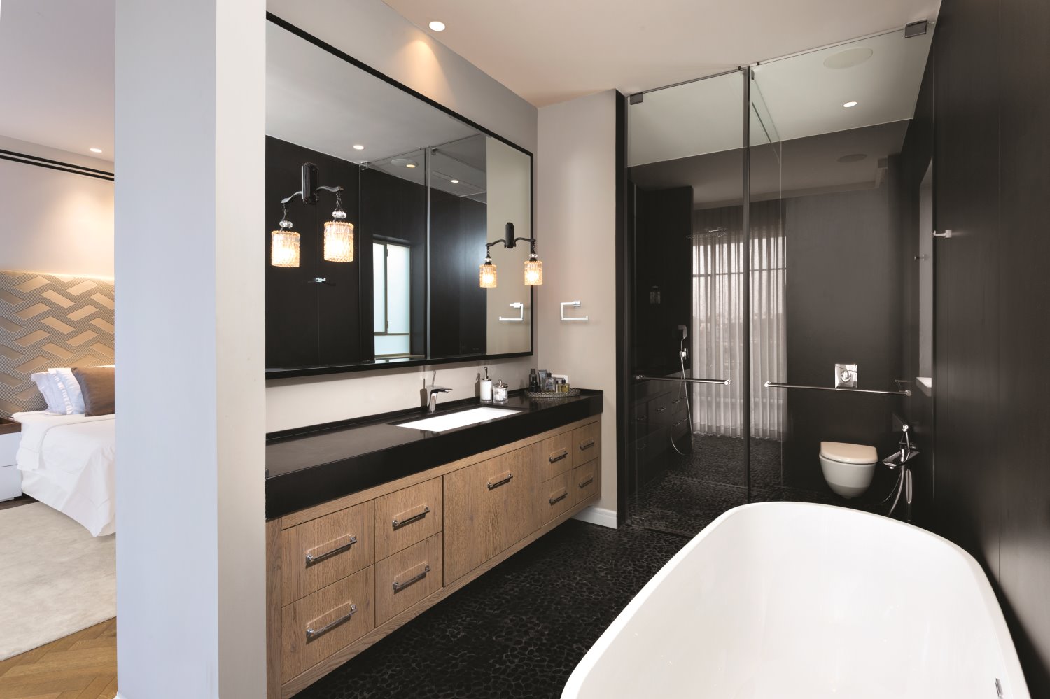 "בחדר הרחצה של ההורים בחרנו בקונספט שחור, עם נגיעות של עץ אלון ושל לבן", מספר חסון. "הרצפה מחופה בחלוקי נחל שחורים עם רובה שחורה, וכיוון שברצפה יש כבר טקסטורה, בחרנו לחפות את הקירות, מהרצפה עד התקרה, באריחים של גרניט פורצלן דק במיוחד, בעובי של 6-3 מ"מ ובטקסטורת משי יפה, להעמקת המראה. זה יוצר מראה נקי, נעים ומרשים במיוחד, לאור העובדה שהתקרה בחלל מתנשאת לגובה של כמעט ארבעה מטרים. כל הכלים הסניטריים בחדרי הרחצה והחיפויים נרכשו ב-HeziBank".