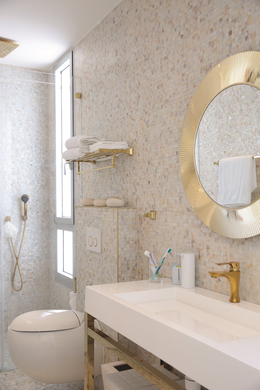 לחדרי הרחצה בחרה צ'פרק אריחי פסיפס המשמשים לריצוף ולחיפוי הקירות: בזה של הילדים גונם משלב משחקי לבן ואפור, ובזה של סוויטת ההורים גונם הוא גוון טבעי של אם הפנינה. יחידות הכיור, שעוצבו כשילוב של מעמד מתכת וכיור מלבני, כמו גם המראות והאביזרים המשלימים, הותאמו לגוני הפסיפס: גוונים כסופים בחדר הרחצה של הילדים, וגוונים זהובים בחדר הרחצה של ההורים, בו משתלבת מראת זהב עגולה ואלגנטית למראה.