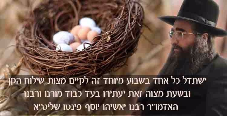 דבר תורה לפרשת כי תצא - מפי כבוד האדמו"ר רבי יאשיהו יוסף פינטו שליט"א "כי יקרא קן ציפור לפניך בדרך בכל עץ או על הארץ אפרוחים או ביצים והאם רובצת על האפרוחים או על הביצים לא תיקח האם על הבנים שלח תשלח את האם ואת הבנים תקח לך למען ייטב לך והארכת ימים" (דברים כב, ו).