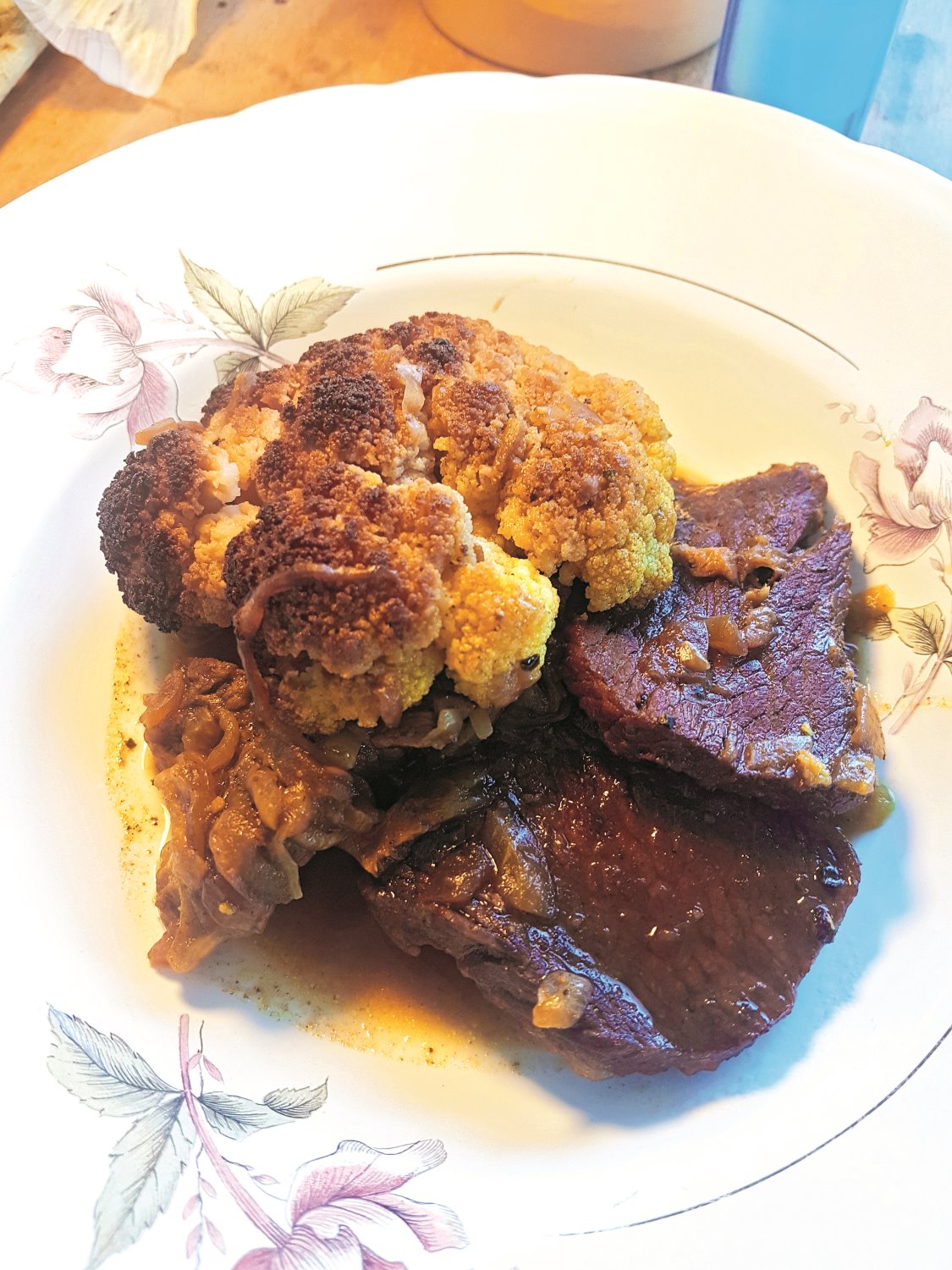 כרובית בשתי צורות. האחת צמחונית/טבעונית (בקיצור, ללא בשר) ברוטב עגבניות חריף.