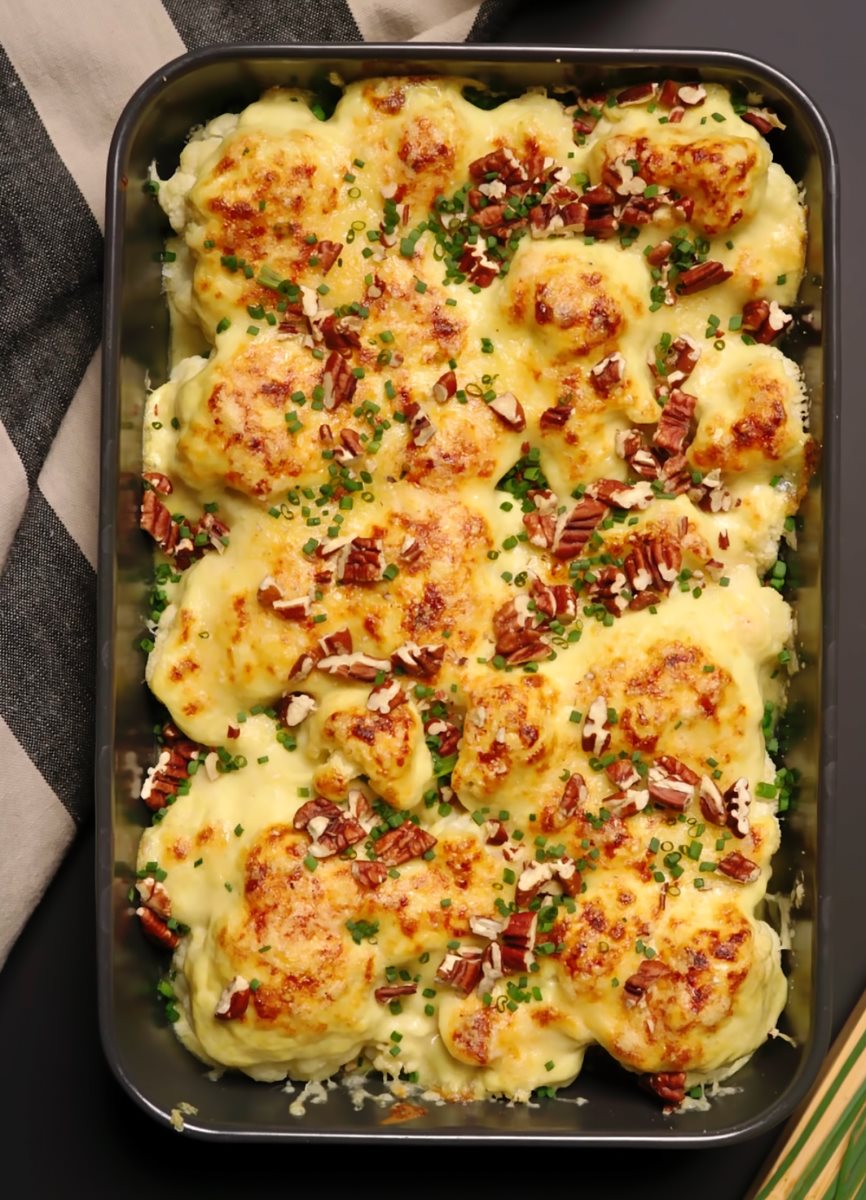 מניחים את הכרובית בתבנית אפייה, מכסים בבשמל ומפזרים מלמעלה גבינת אמנטל.