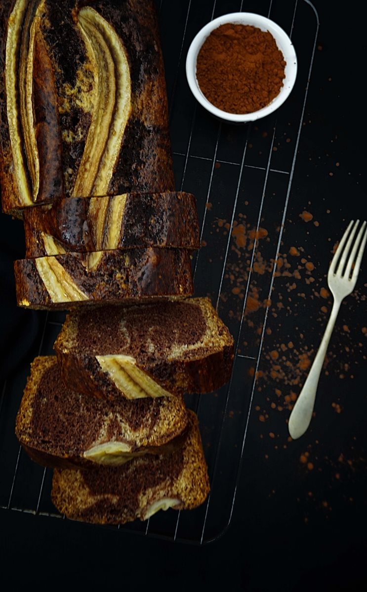 מניחים מחצית מהבלילה בתבנית מכוסה בנייר אפייה. מוסיפים לשאר הבלילה 20 גר' אבקת קקאו ומערבבים.
