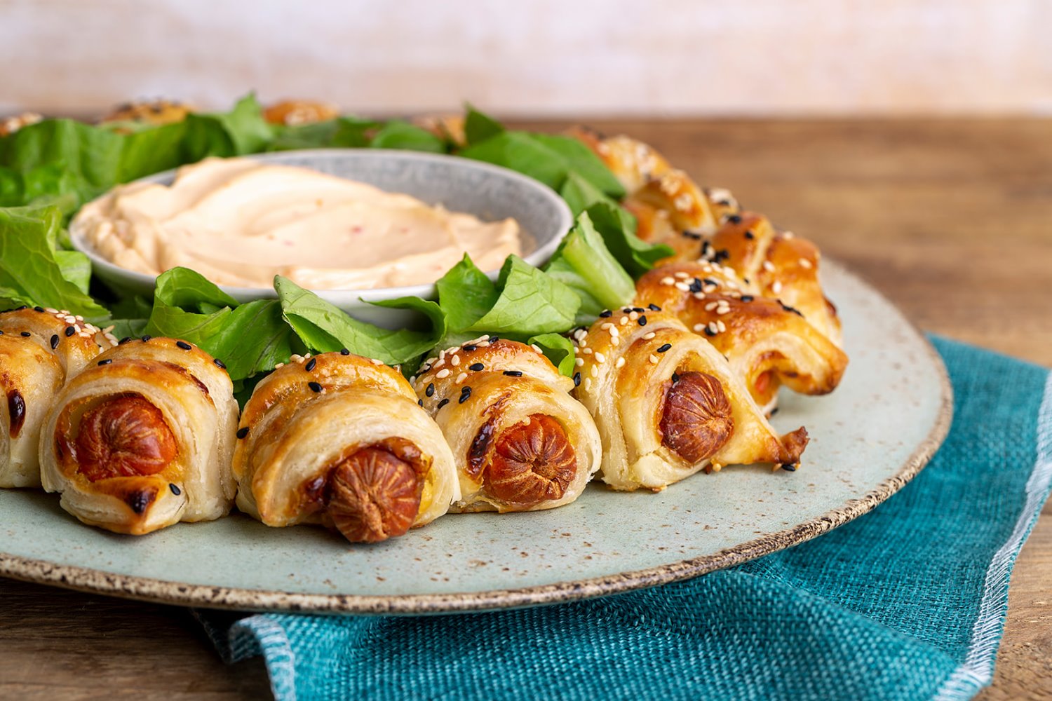 - מסדרים את הנקניקיות העטופות על גבי התבנית בעיגול, מברישים את המאפה בביצה טרופה, מפזרים מעל את שני סוגי השומשום ואופים בין 15 ל-20 דקות, או עד להזהבה יפה.