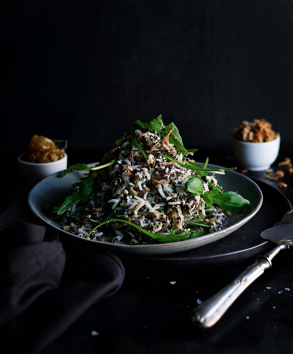 מערבבים יחד את האורז, הקינואה, עשבי התיבול השום הקצוץ וגרידת הלימון ומתבלים במיץ לימון, מלח ושמן זית. מגישים עם בצל צלוי מעל.