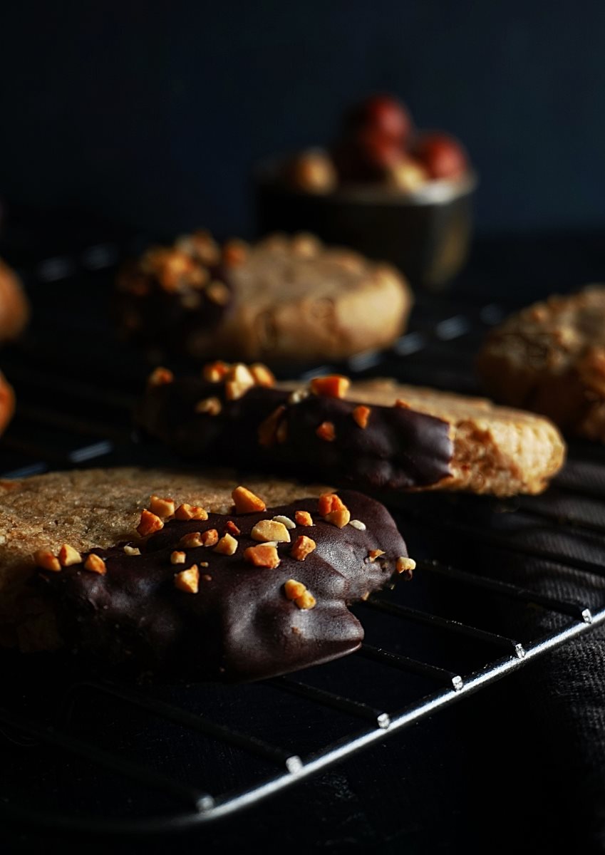 לקישוט העוגיות ממיסים שוקולד מריר על אדי מים רותחים (שיטת בן מארי), טובלים חצי מכל עוגייה, מניחים שוב על נייר פרגמנט, מוסיפים כמה חתיכות אגוזי לוז למעלה ונותנים לעוגיות להתקרר.