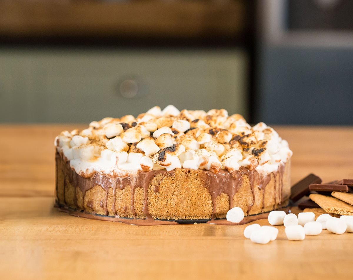 - לפני ההגשה: מוציאים את העוגה מהמקפיא וממתינים כ- 10 דקות. לאחר מכן מפזרים מעל מיני מרשמלו ובעזרת ברנר משחימים מעט את המרשמלו עד לקבלת גוון זהוב חום.