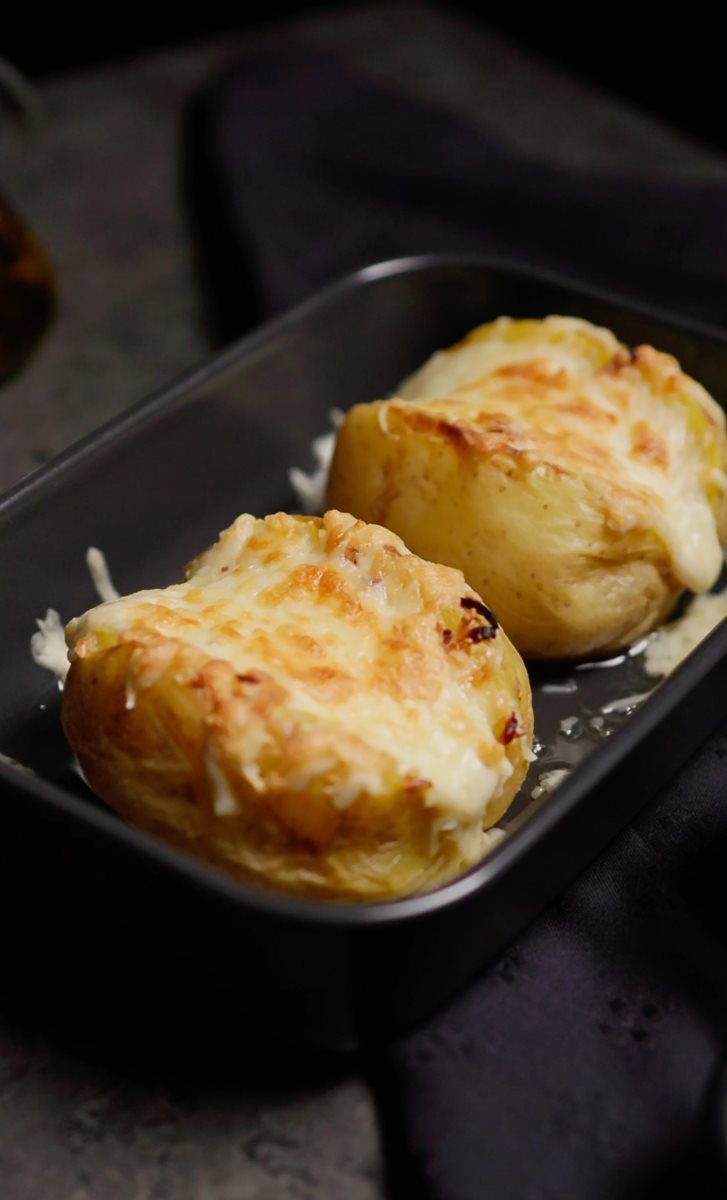 מניחים גבינה מגוררת בתוך תפוח האדמה ומכניסים למיקרוגל כדי לצלות את הגבינה, למשך 7 דקות.