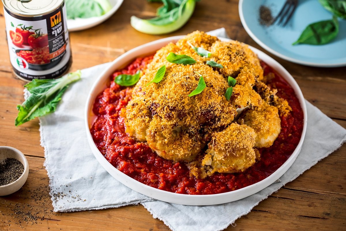 - מניחים את הכרובית החמה על רוטב העגבניות ומגישים.