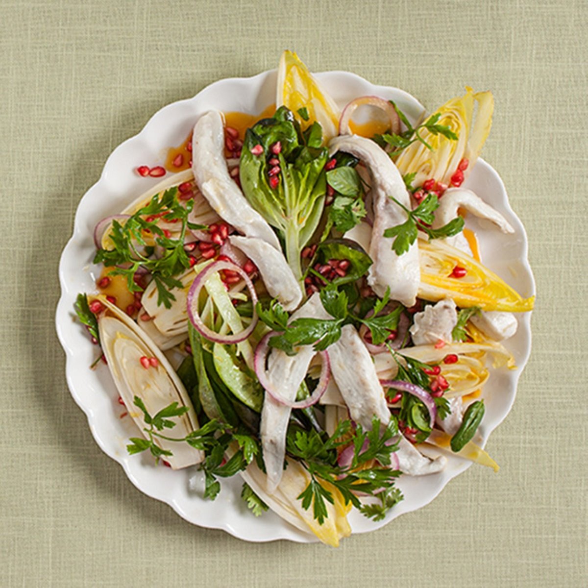 » מרכיבים ומגישים: מסדרים בצלחת הגשה גדולה אנדיב וחסה. מניחים מעל את רצועות הדג הכבוש, פרוסות בצל, עלי פטרוזיליה וגרגירי רימון. מזלפים שמן זית ומיץ גזר מצומצם. מתבלים במלח ופלפל ומגישים מיד.