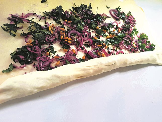 מוסיפים את הצימוקים ואת אגוזי המלך, מתבלים בכוסברה יבשה וירוקה כדקה, מכבים ואז מקררים לטמפרטורת החדר ומניחים על הבצק הדק שרידדנו.