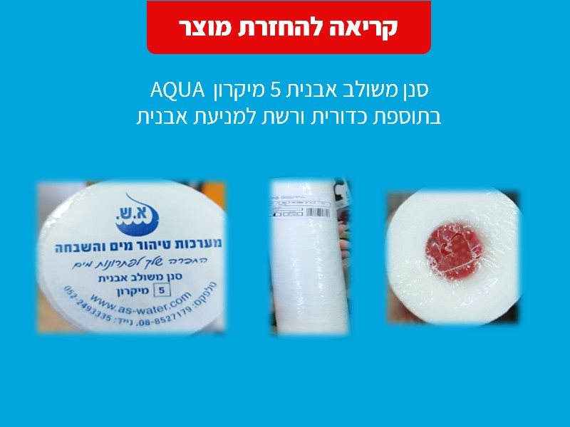 חברת "א.ש. מערכות מים והשבחה -יצחק שם טוב" קוראת לציבור להפסיק את השימוש מיידית במוצר ששווק ונמכר על ידה: סנן משולב אבנית 5 מיקרון AQUA בתוספת כדורית ורשת למניעת אבנית. מדובר בסנן המשמש לטיהור מי שתיה ביתיים באמצעות מערכות סינון. . סוג הסיכון שאותר במוצר הוא רעילות, לאחר שבבדיקה מטעם הממונה על התקינה, באמצעות מכון התקנים, נמצא כי כי המוצר המפורט לעיל אינו מתאים לדרישות התקן הרשמי , ת"י 1505 חלק 1 - מערכות לטיפול במי שתייה לשימוש ביתי-סינון וטיהור: מערכות, למעט מערכות אוסמוזה הפוכה, מספטמבר 2009. . בעקבות הליקויים, יש להחזיר את המוצר, והוא איסור לשימוש במי שתייה. המוצר הינו סנן 50 מיקרון ששווק על ידי החברה כ-5 מיקרון בניגוד לייעודו. נוסף על כך, במיצוי המים אובחנה פעילות רעילות, ואינו ממלא את ייעודו כמפחית חלקיקים.