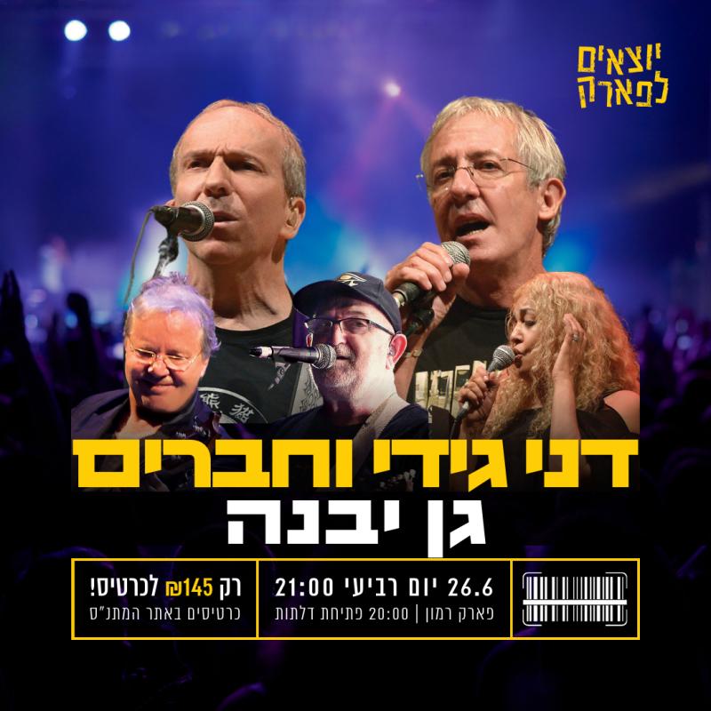 פארק רונה רמון גן יבנה, 26.6 פתיחת דלתות בשעה 20:00. מחיר כרטיס לתושבי גן יבנה 145 ₪.