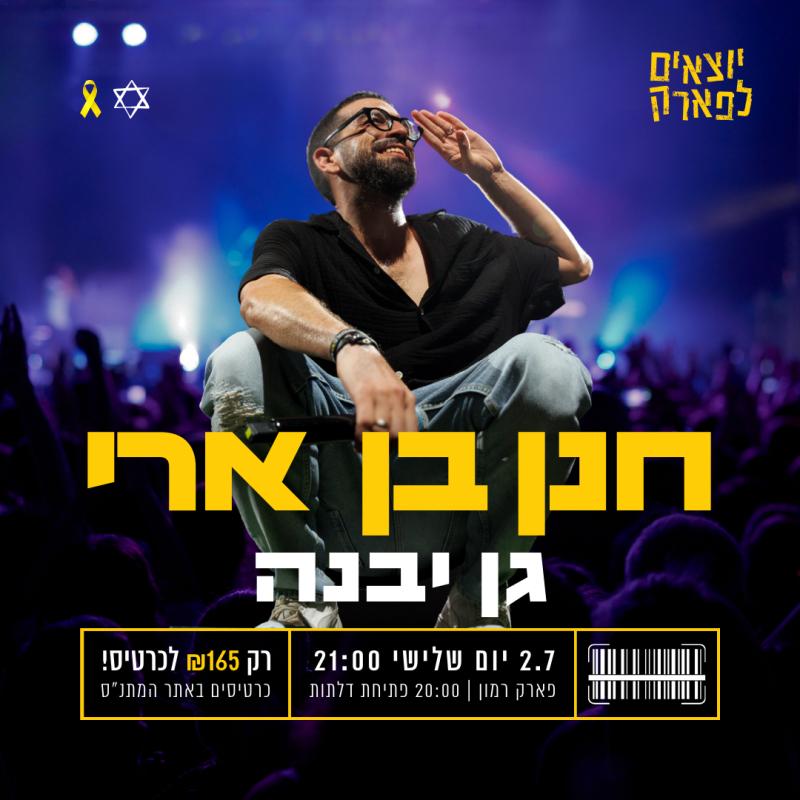 חנן בן ארי, מרגיש בבית בגן יבנה. אהבת הקהל והפרגון האינסופי, מביאים את חנן להופעה נוספת בגן יבנה, במסגרת יוצאים לפארק 4, אין ספק שגם להופעה זו יאזלו הכרטיסים במהירה.