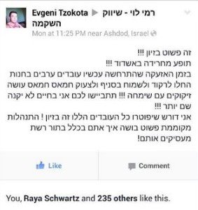 רשת הפייסבוק לא נחה לרגע . אשדודי העונה לשם יבגני צוקוטה העלה פוסט בו הוא מתאר מה קרה בעת ההאזעקה בסניף רמי לוי : "בזמן האזעקה, עובדים בחנות רמי לוי החלו לרקוד ולשמוח בסניף וצעקו "חמאס חמאס" עושים זיקוקים" ,והוסיף "אני דורש לפטר את כולם , אני בחיים לא אקנה שם יותר".